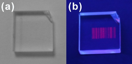超快激光在石英玻璃中写入的条形码图案在(a)日光下不可见,在(b)254 nm紫外光激发下发出红色荧光