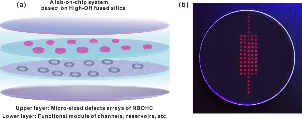 (a) 基于羟基石英玻璃中的芯片实验室示意图以及(b)超快激光在羟基石英玻璃内部制备的缺陷中心红色荧光阵列